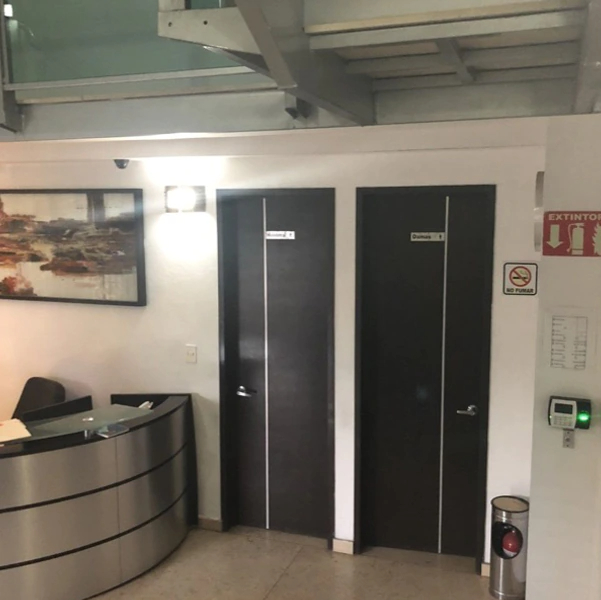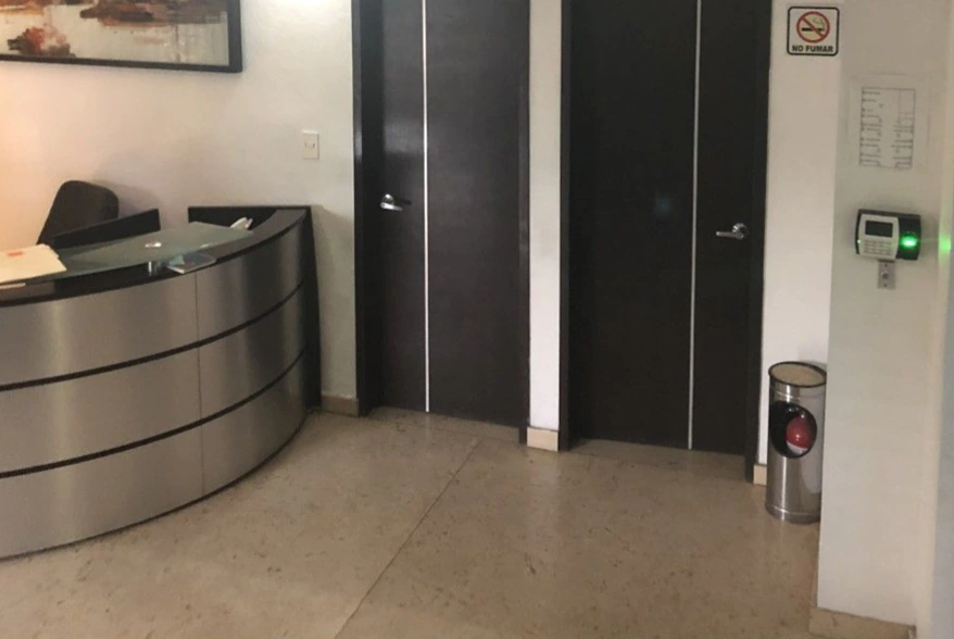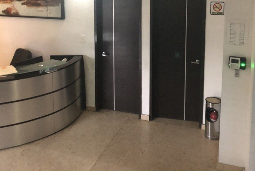 Recepción, baños para hombres y mujeres, bodega y estacionamiento con portón eléctrico.